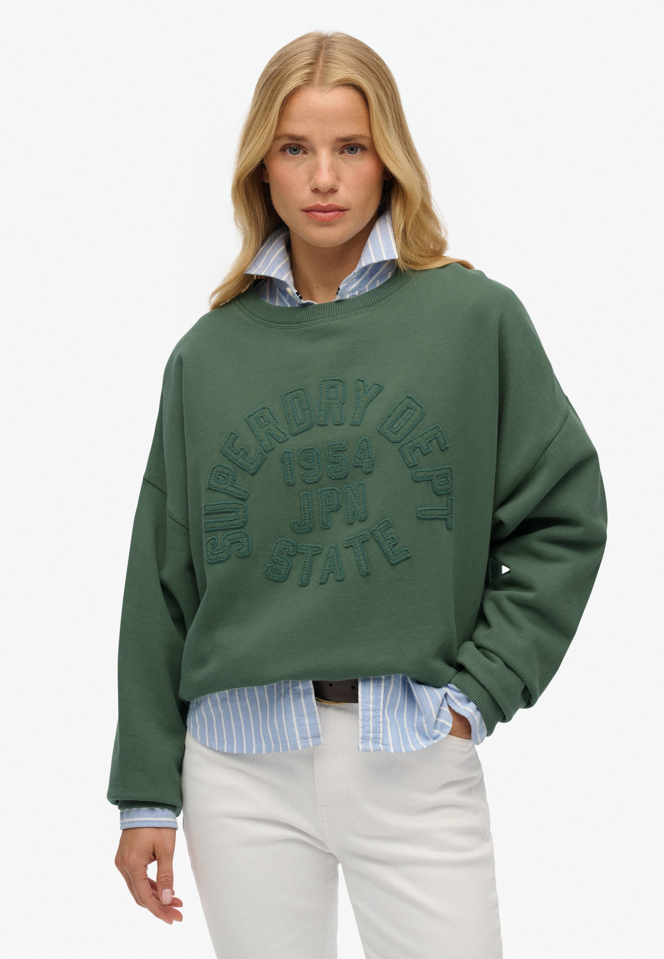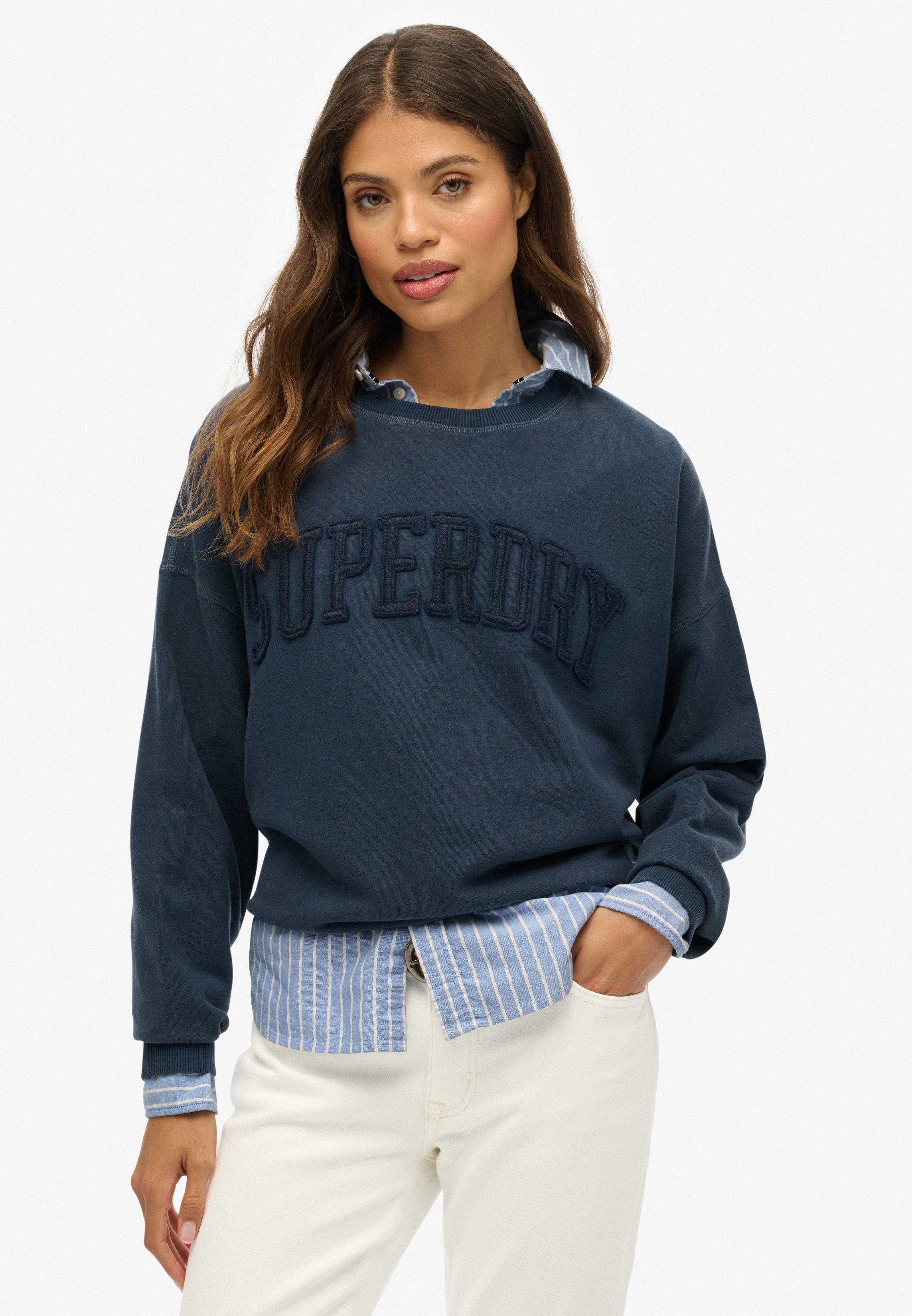 Crew sweatshirt with tonal appliqué graphics and minimalist cut. Soft fleece-backed knit offers lightweight warmth. Subtle branding in clean silhouette.