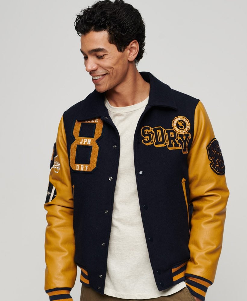 Perfect for bringing an American classic to your personal wardrobe and layering options, the College Varsity Patched Bomber Jacket is your new go-to. A modern interpretation of the classic letterman jacket, the authentically styled branding allows you to match this varsity-style bomber jacket with many other pieces in your wardrobe to build a look that wouldn't look out of place on a 50s campus.