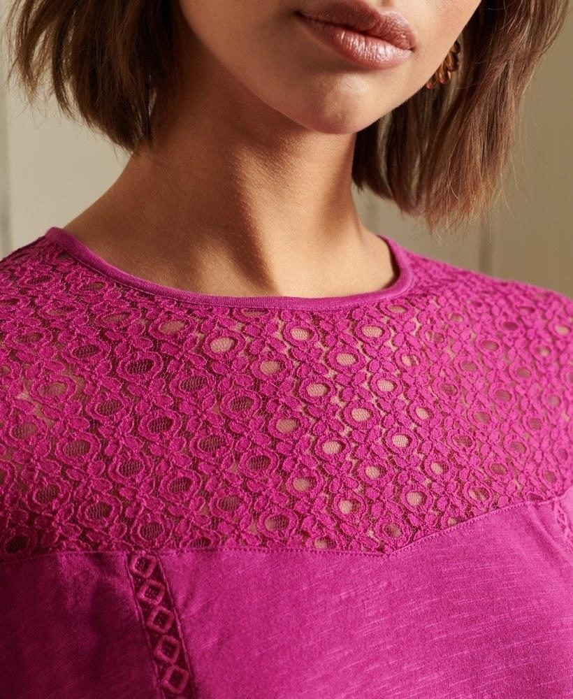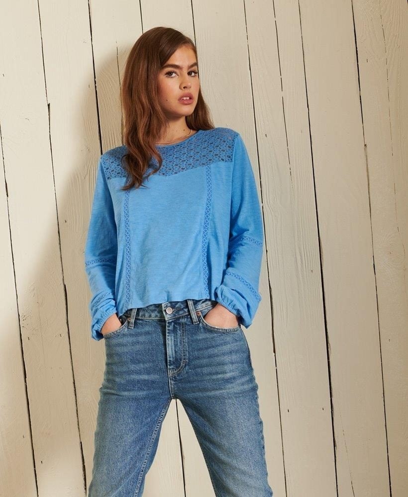 Bring that bohemian vibe of summertime into the colder months and rock the chic look of classic lace detailing. This beautiful piece features long sleeves to help keep you comfortable on those cooler days. Classic crew neckline, Single-button fastening, Long sleeves, Elasticated cuffs, Lace detailing, Signature logo metal tab.