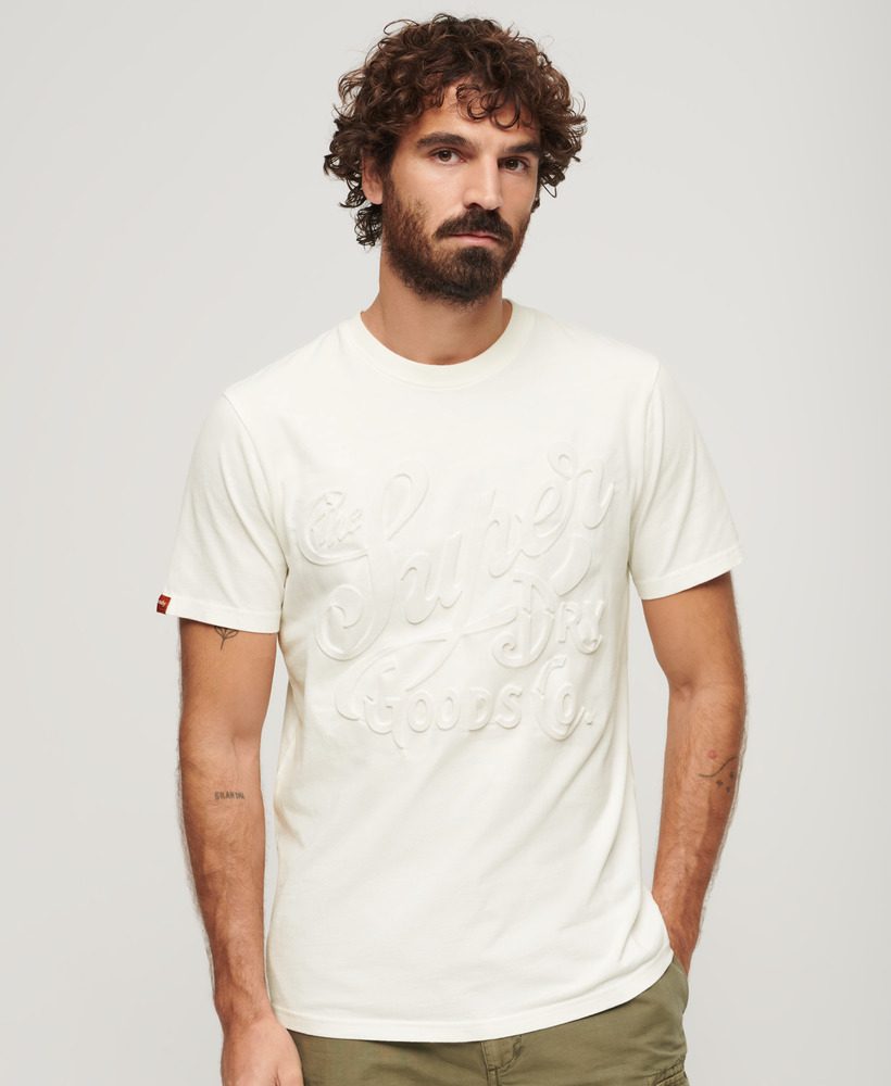 A vintage-inspired tee with an embossed graphic, likely referencing Superdry's archives. The graphic could be a retro logo, a vintage photograph, or a classic design element, capturing the brand's heritage. The embossed texture adds depth and visual interest, making this tee a standout piece. The graphic can be placed on the front, back, or sleeves, and the embossing can be raised or flat, depending on the specific design.