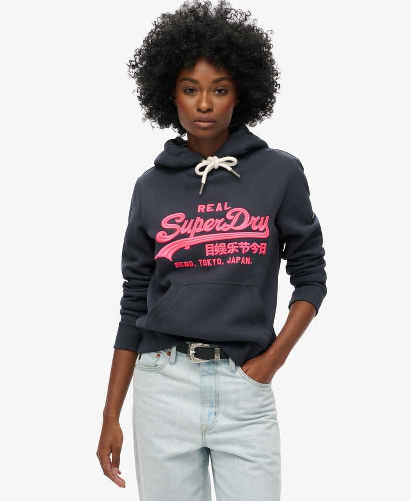 The classic layering piece to complete your wardrobe, this Neon Vintage Logo Embroidered Graphic Hoodie features the Superdry logo with a vintage style. An effortless way to shake up your casual style, the ribbed trims and brushed lining ensure you feel as cosy as possible. Its pop of neon style finishes off your casual look with a retro spirit. , Relaxed fit – the classic Superdry fit. Not too slim, not too loose, just right. Go for your normal size, Drawcord hood, Embroidered neon logo, Large front pocket, Ribbed cuffs and hem, Brushed lining, Superdry tab on sleeve.