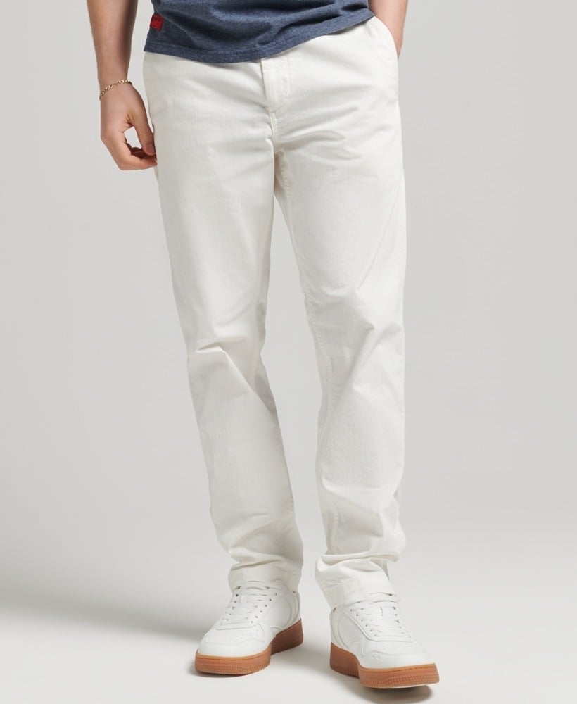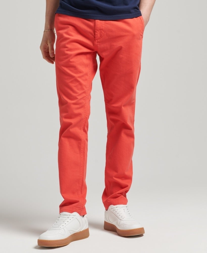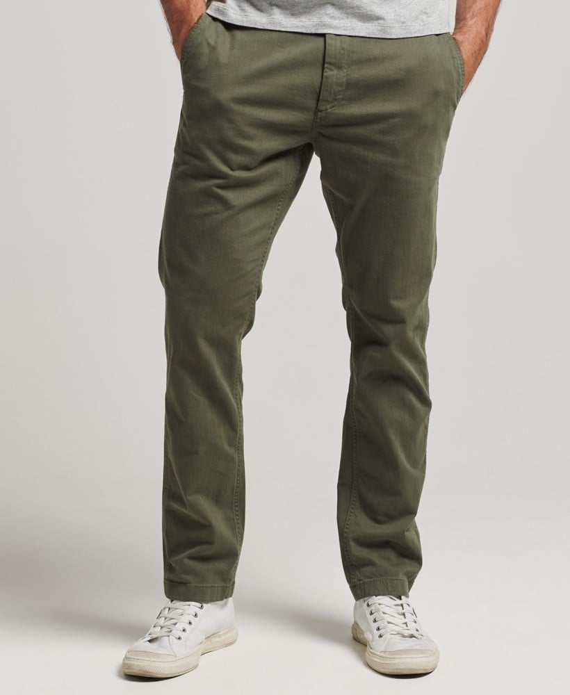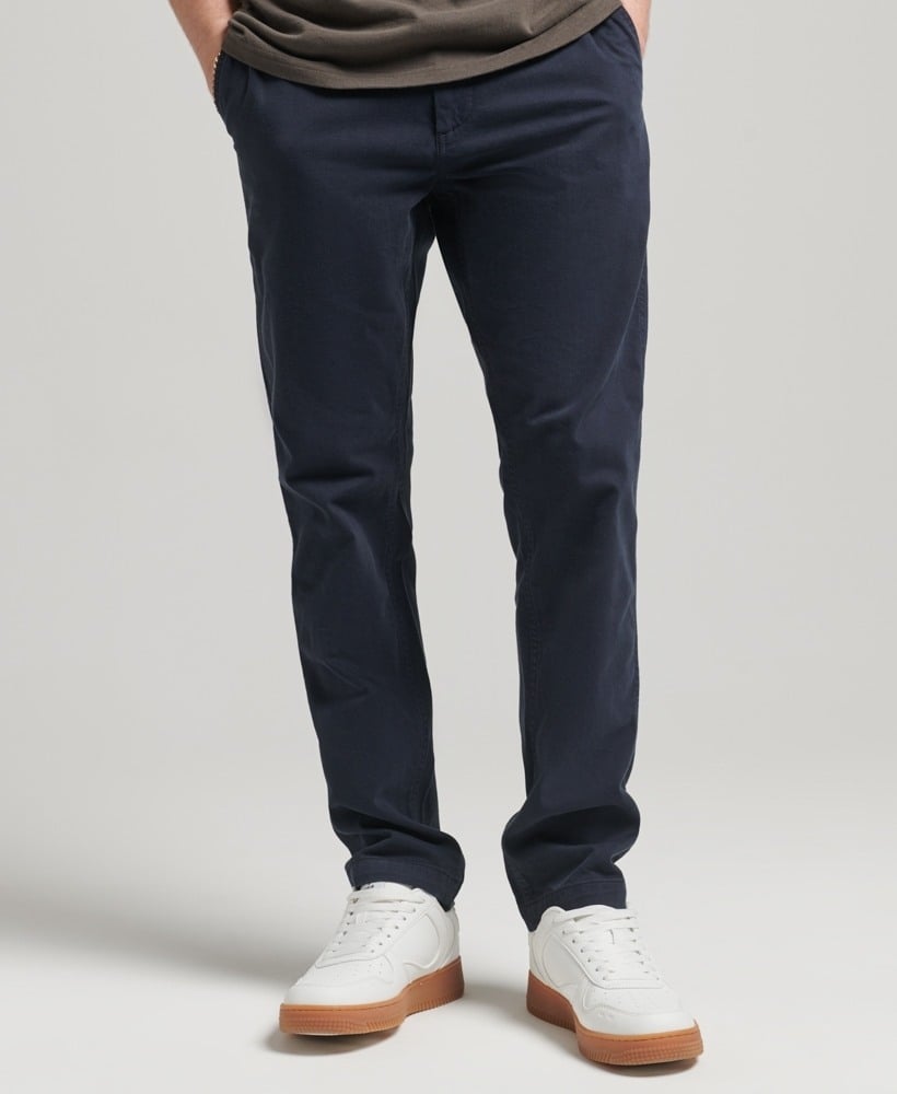 The chino trouser is a classic and very much an essential for your capsule wardrobe, no matter the weather. With our overdye technique giving the chino twill fabric a vintage feel, you'll be at home in the Officer's slim fit chino trousers. Slim Fit. With enough room to move, these slim fit chinos are cut for a sleek silhouette that sits close to the body yet are still easy to wear., Classic chino twill fabric, Overdyed finish, Button fastening with zip fly, Two front pockets plus a single coin pocket, Two back pockets with button fastening, Belt loops, Superdry branding.