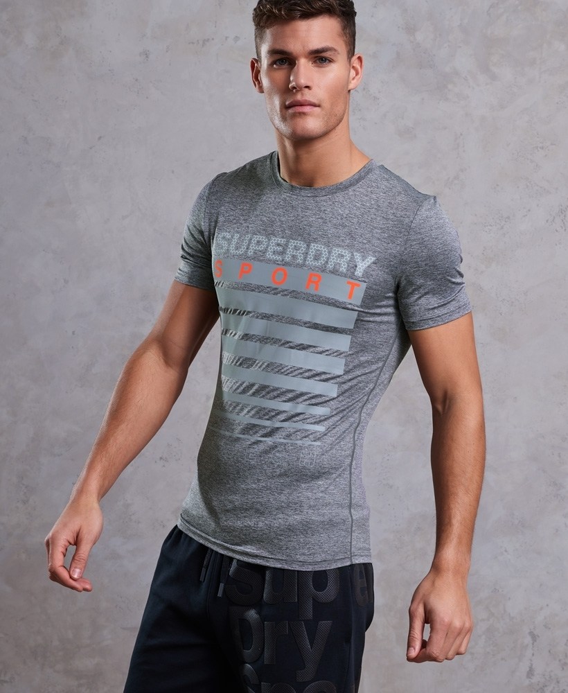 Superdry men’s Athletic graphic t-shirt. This short sleeve t-shirt is perfect for this season’s workouts. It is made from moisture wicking fabric and features a large reflective graphic on the front. The Athletic graphic t-shirt is finished with reflective seams and a Superdry Sport logo badge on the sleeve.