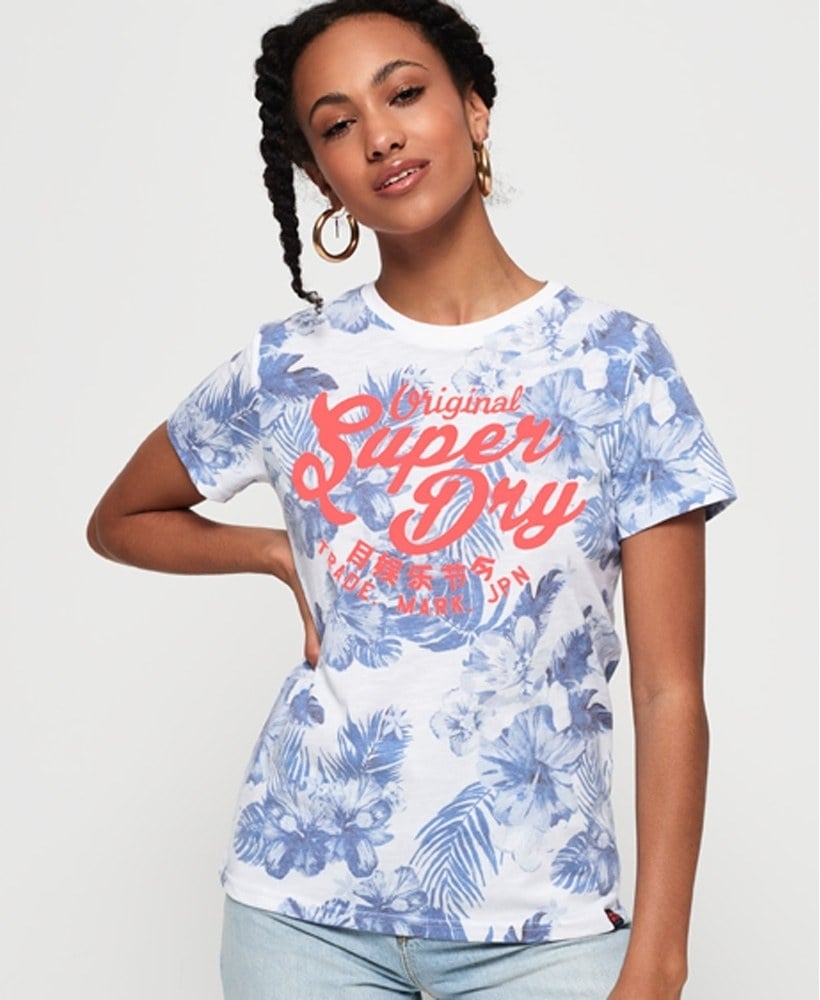 Superdry women's Original hibiscus t-shirt. A classic style t-shirt featuring short sleeves, crew neckline and an all over floral design. Finished with a textured Superdry logo across the chest and a Superdry logo tab on the hem. Slim fit