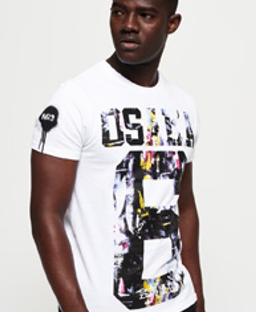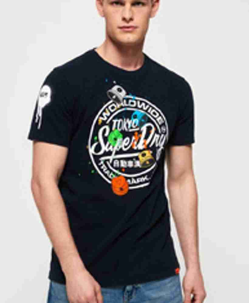 Superdry men's Super 5 t-shirt. This classic style crew neck t-shirt features a vibrant Superdry print on the chest along with a graffiti-style spray mark on the sleeve. The Super 5 t-shirt is finished with a Superdry logo tab on the hem. Slim fit – designed to fit closer to the body for a more tailored look, Crew neck, Short sleeves, Graphic print, Graphic print on right arm.