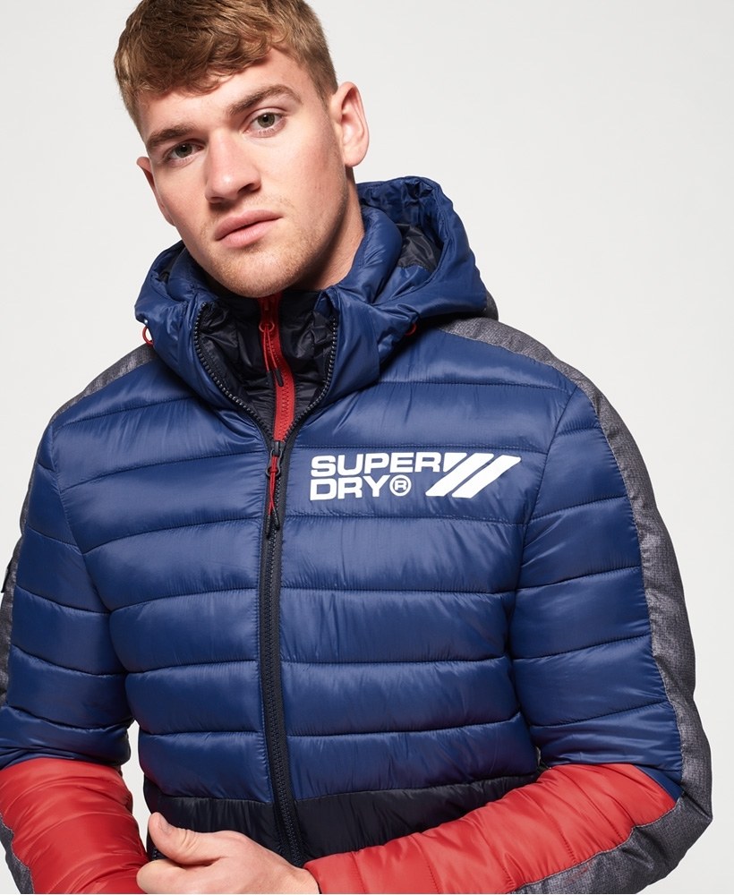 Superdry men's New colour block Fuji jacket. This jacket features a main double zip fastening, removable hood, two zip fastened front pockets and one inside popper fastened pocket. Finished with a textured Superdry logo down both sleeves.