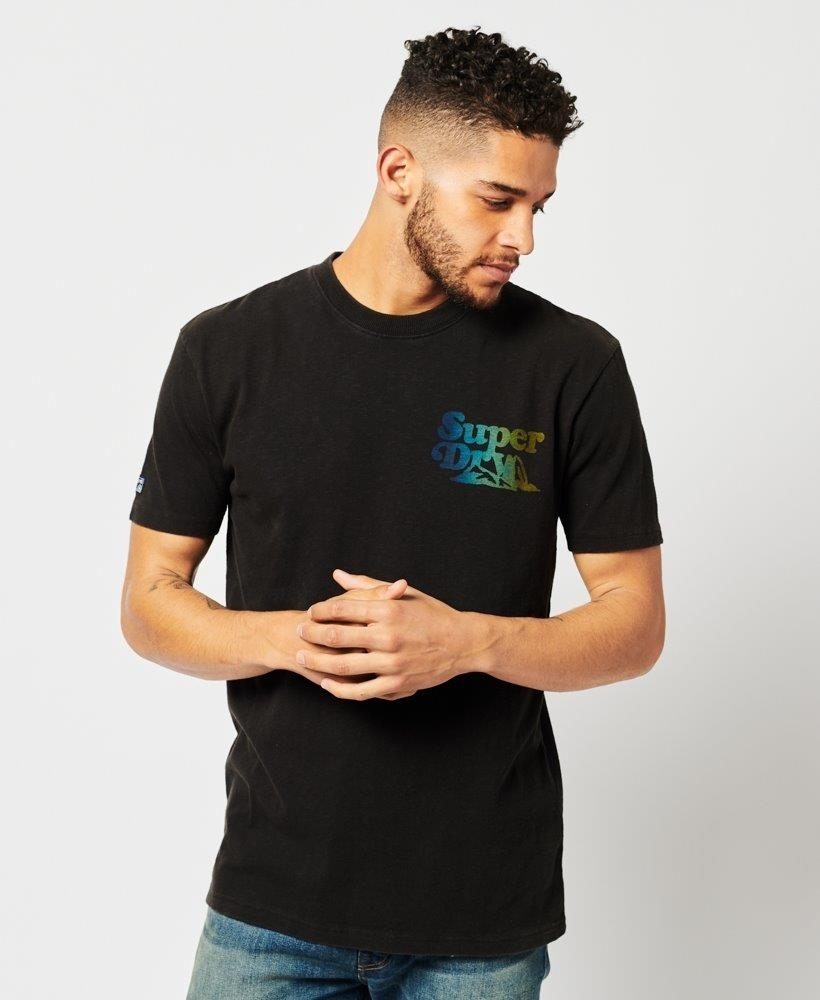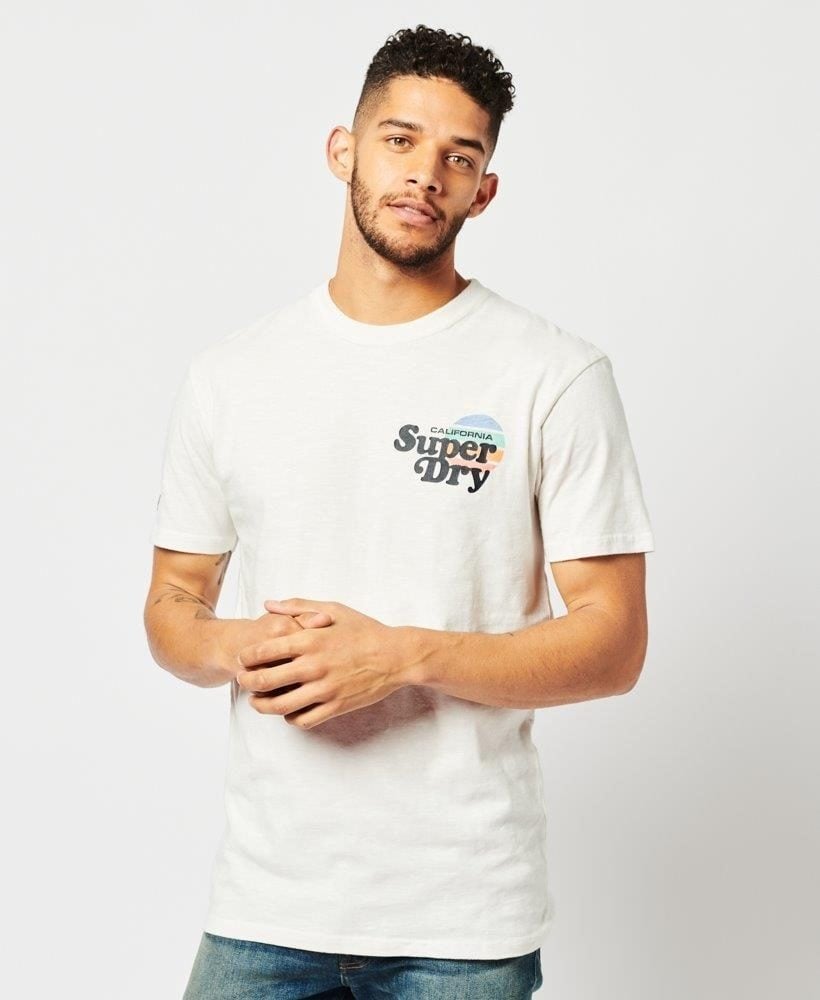 Spruce up your casual options with a t-shirt that adds a vibe of vacation to your look. With its nostalgic print and classic design, it will make every day feel just a little bit more like a holiday. Relaxed fit – the classic Superdry fit. Not too slim, not too loose, just right. Go for your normal size, Ribbed crew neck collar, Short sleeves, Distressed printed logo, Signature Superdry tab.