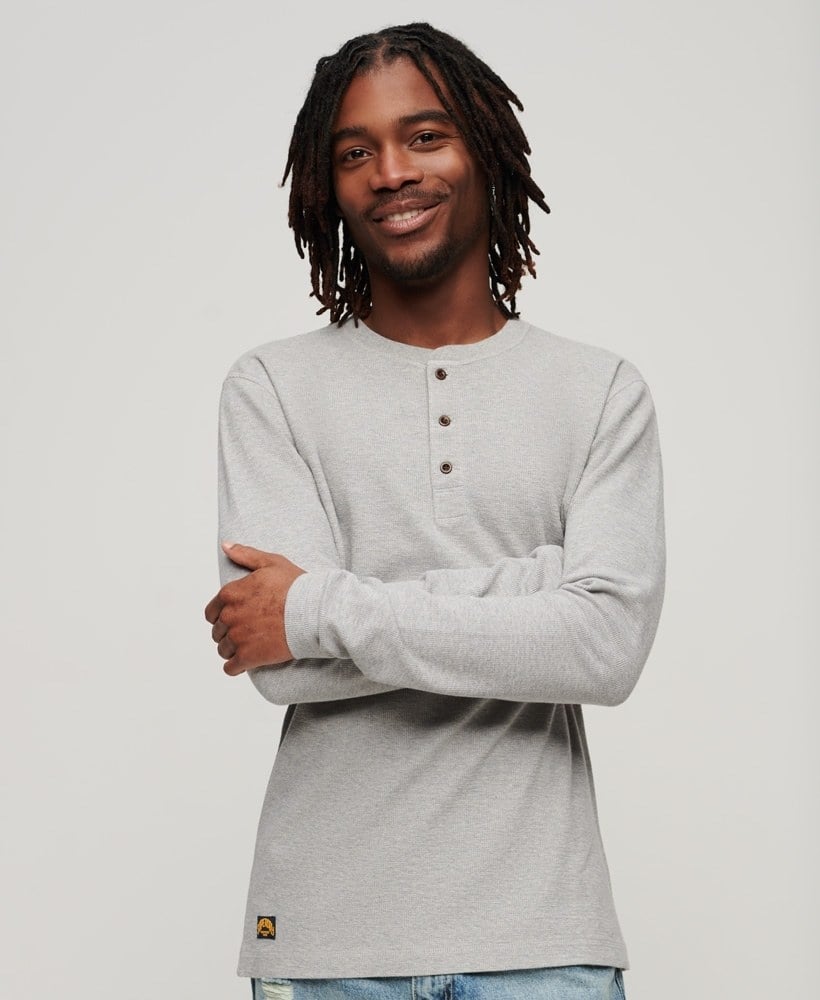 Our Waffle Long Sleeve Henley Top is a subtle way to restyle your look. We've taken the classic henley design and elevated it with a textured waffle knit, creating a distinctive look that feels effortless. Whether you're putting together a laid-back look, or opting for something that sharpens up your style, this top is sure to enhance your confidence. Relaxed fit – the classic Superdry fit. Not too slim, not too loose, just right. Go for your normal size, Waffle style knit, Three-button Henley collar, Button fastening, Long sleeves, Superdry patch.