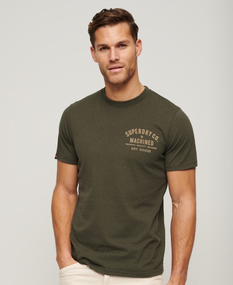 A rugged and edgy tee inspired by workwear aesthetics. The distressed or flocked graphic might depict tools, machinery, or industrial landscapes, reflecting Superdry's appreciation for vintage styles. The tee is designed for a comfortable fit and is perfect for casual wear or adding a touch of rebellion to your outfit. The graphic can be large and bold or more subtle and understated, depending on personal preference.